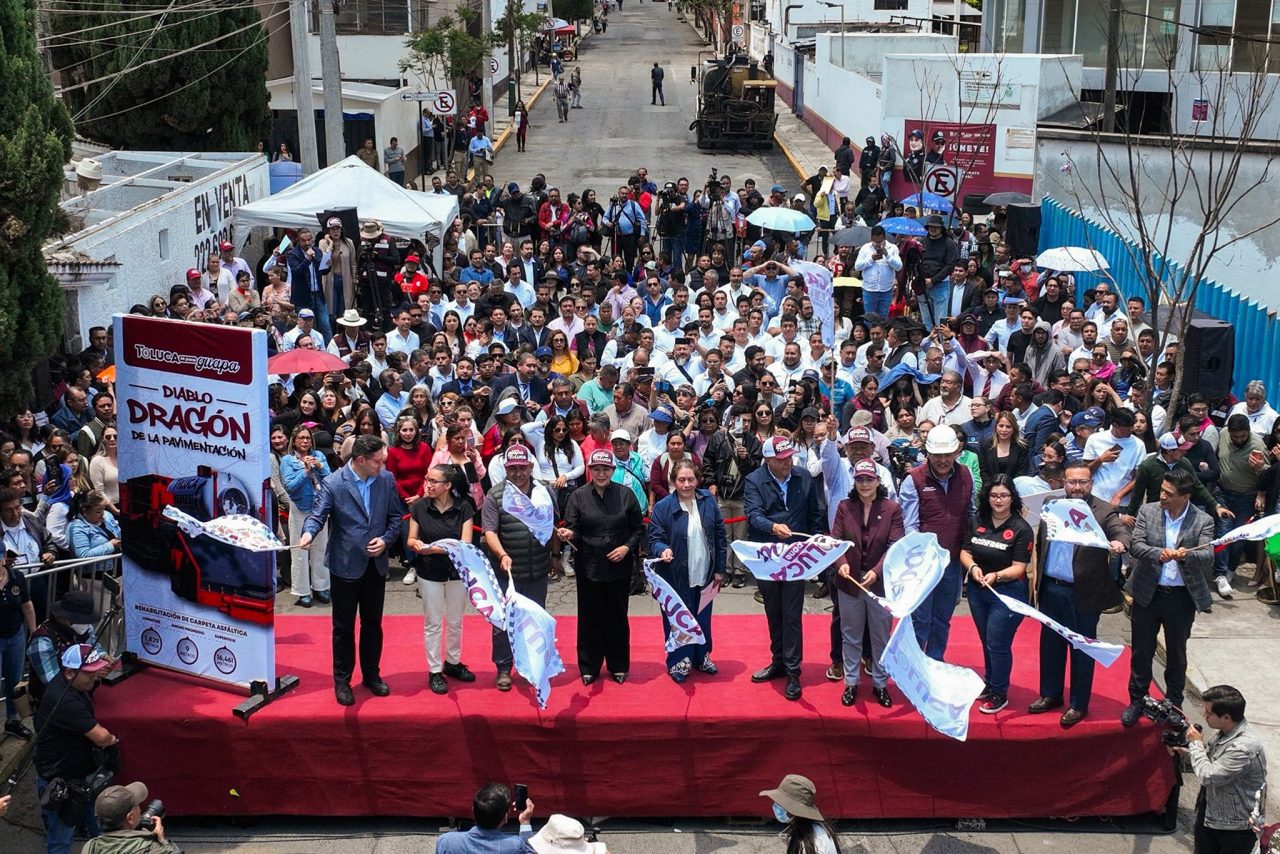 La gobernadora Delfina Gómez dio el banderazo de inicio a la rehabilitación de la avenida Valentín Gómez Farías, donde operará el tren de pavimentación “Diablo Dragón”.