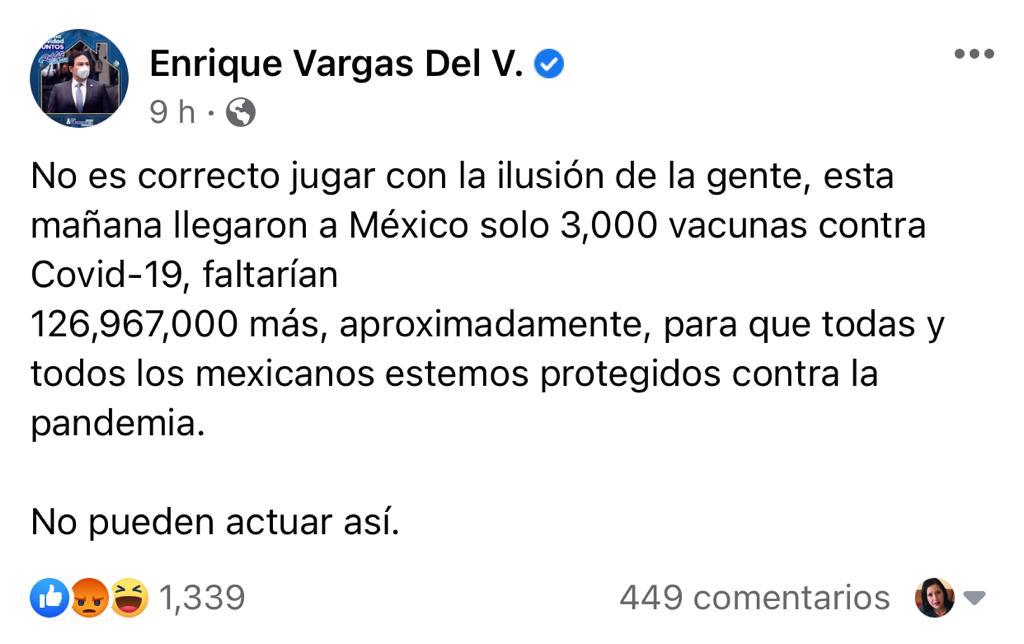 A través de sus redes sociales Enrique Vargas descalificó este actuar, pues, dijo, “faltarían aproximadamente 126,967,000 vacunas más para que todas y todos los mexicanos estemos protegidos contra la pandemia”
