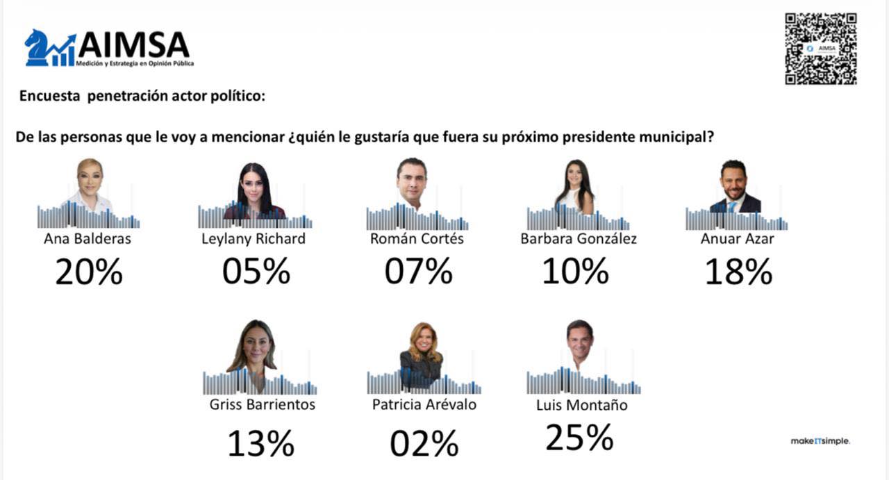 A la pregunta ¿quién te gustaría que fuera tu próximo presidente municipal? Luis Montaño se perfiló con 25 por ciento de la preferencia; Ana Balderas con 20%, Anuar Azar con 18 por ciento, mientras Gris Barrientos alcanzó 13 por ciento.