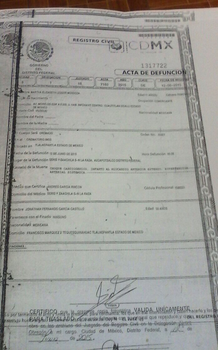 De acuerdo con el testimonio recabado por el equipo de Zona Cero Noticias la señora Martha Elizabeth L. M. falleció el pasado viernes 12 de junio de 2015, la razón según el acta de defunción: choque cardiogénico-infarto al miocardio.